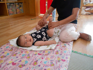 そのあとは、便秘がちな赤ちゃんに、便秘が解消できるマッサージもしました。